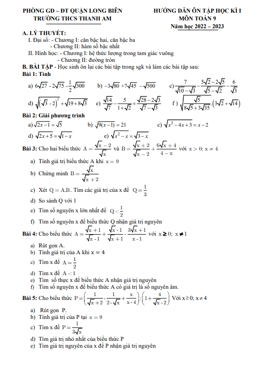 Hướng dẫn ôn tập cuối học kì 1 (HK1) lớp 9 môn Toán năm 2022 2023 THCS Thanh Am Hà Nội