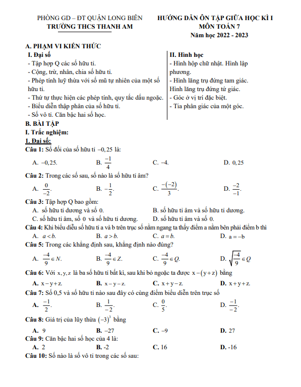 Hướng dẫn ôn tập giữa học kì 1 môn Toán lớp 7 năm học 2022 – 2023 THCS Thanh Am Hà Nội