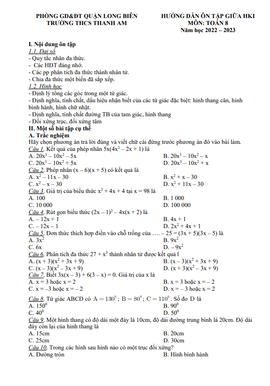 Chúng ta hãy cùng tìm hiểu nội dung ôn tập giữa học kì 1 môn Toán lớp 8 năm học 2022-2023 tại trường THCS Thanh Am. Trong phần này, chúng ta sẽ học về các khái niệm quan trọng như đại số và hình học.