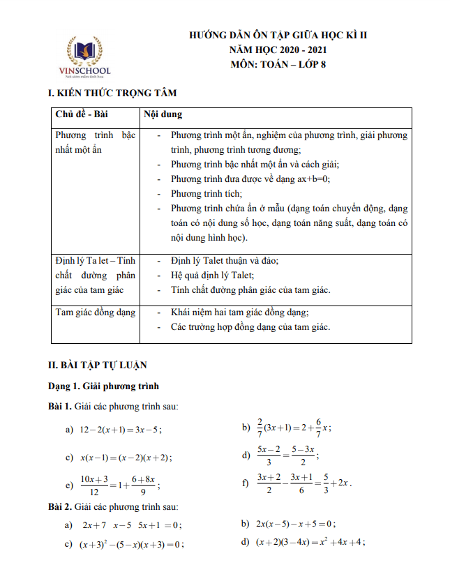 Chào quý thầy cô và các em học sinh lớp 8! Sytu xin giới thiệu đến mọi người đề cương hướng dẫn ôn tập giữa kì 2 Toán lớp 8 năm học 2020 – 2021 trường Vinschool – Hà Nội, nhằm giúp các bạn chuẩn bị cho kỳ kiểm tra khảo sát chất lượng môn Toán lớp 8 giai đoạn giữa học kỳ 2 năm học 2020 – 2021.