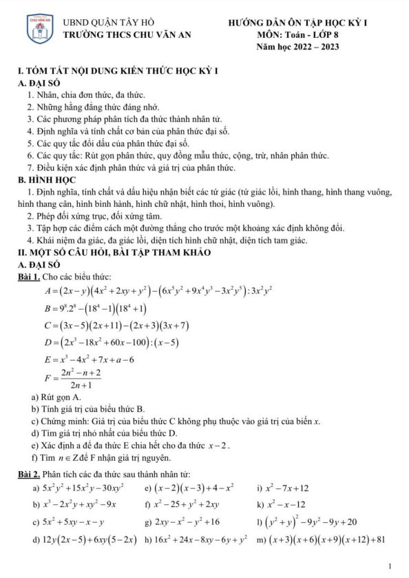 Xin chào quý thầy cô và các em học sinh lớp 8! Dưới đây là đề cương hướng dẫn ôn tập cuối học kỳ 1 môn Toán lớp 8 năm học 2022 – 2023 tại trường THCS Chu Văn An, quận Tây Hồ, thành phố Hà Nội.