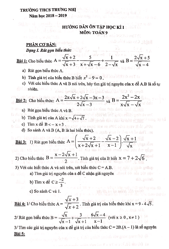 Hướng dẫn ôn tập học kì 1 Toán lớp 9 năm 2018-2019 trường THCS Trưng Nhị Hà Nội