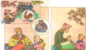 Tranh 1 : Quân lính đang dùng loa đọc lệnh của nhà vua yêu cầu mỗi làng phải nộp một con gà trống biết đẻ trứng. Nghe rõ lệnh này dân làng lo sợ vì không thể kiếm đâu ra gà trống đẻ trứng và sẽ bị nhà vua trị tội.
