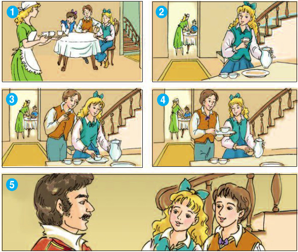 3. Không thấy Ma-ri-a đâu, anh trai của cô bé bèn chạy đi tìm. Khi đi ngang qua nhà bếp, cậu bỗng nhìn thấy Ma-ri-a đang làm gì đó với đống bát đĩa trên bàn ăn, bèn trêu em: