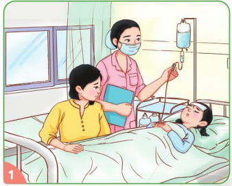 Kể chuyện theo tranh và trả lời câu hỏiHình ảnh: Trang 61 Một lần đến bệnh việnMai bị ốm, phải nhập viện
