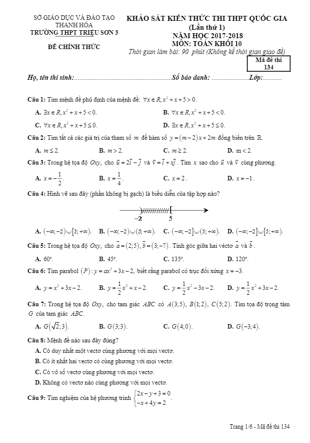 Đề thi khảo sát kiến thức thi THPT Quốc gia lần 1 năm 2017 – 2018 môn Toán lớp 10 trường Triệu Sơn 3, Thanh Hóa