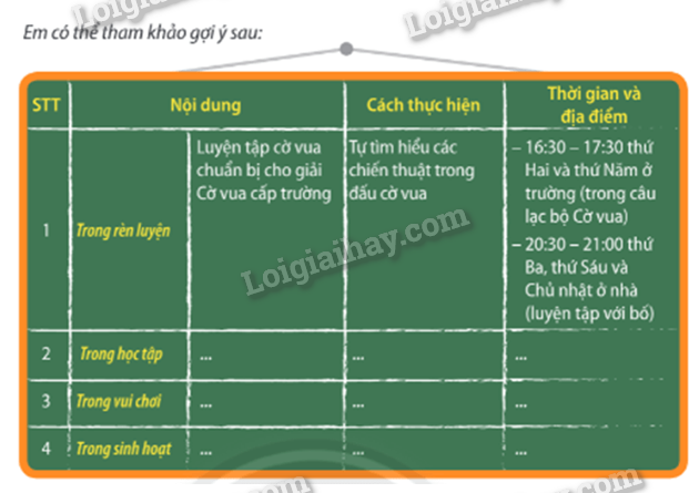 Dựa vào các nội dung yêu cầu kết hợp tham khảo gợi ý để lập bảng kế hoạch và cùng trao đổi với các bạn về kế hoạch của bản thân.