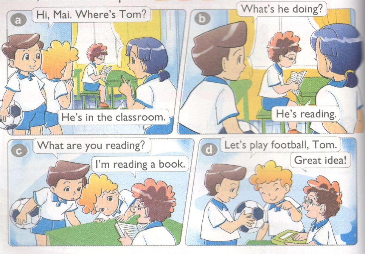 a) Hi, Mai. Where’s Tom? Xin chào, Mai. Tom ở đâu?