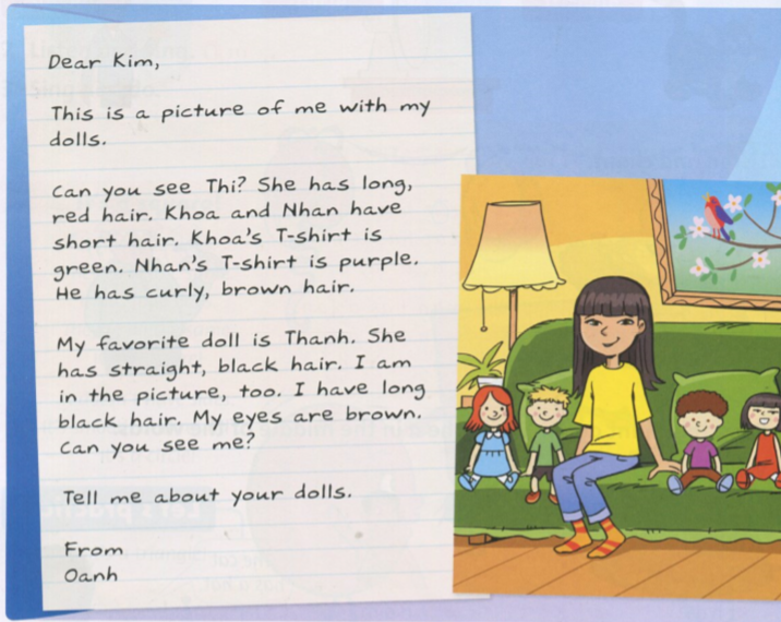 Búp bê yêu thích của tớ là Thanh. Em ấy có mái tóc thẳng, đen. Tớ cũng ở trong hình. Tớ có mái tóc dài đen. Mắt tớ màu nâu. Cậu có nhìn thấy tớ không?