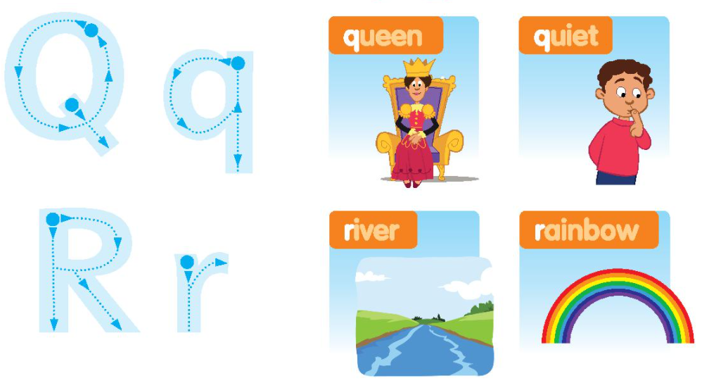 Lesson Three: Sounds and letters – Unit 2: He’s happy! – Tiếng Anh 2 Family and Friends 2: Bài 1 Listen, point and repeat. Write. (Nghe, chỉ và nhắc lại. Viết. ) : queen