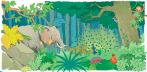Các con vật ẩn trong tranh là: tắc kè, voi, chim công, gà trống, gõ kiến, khỉ.