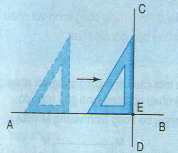 – Chuyển dịch ê ke trượt theo đường thẳng AB sao cho cạnh góc vuông thứ hai của ê ke gặp điểm E. Vạch một đường thẳng theo cạnh đó thì được đường thẳng CD đi qua điểm E và vuông góc với đường thẳng AB.