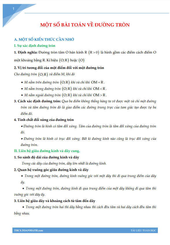 I. Sự xác định đường tròn: Tài liệu bao gồm định nghĩa, vị trí tương đối của một điểm đối với một đường tròn, cách xác định đường tròn và tính chất đối xứng của đường tròn.