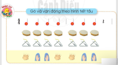 Câu 1, 2 Hướng dẫn giải nhạc cụ trang 13 SGK Âm nhạc 2 – Cánh diều – Chủ đề 2: Biết ơn thầy cô giáo. Gõ và vận động theo hình tiết tấu Ứng dụng đệm cho bài hát: Em thương thầy mến cô.