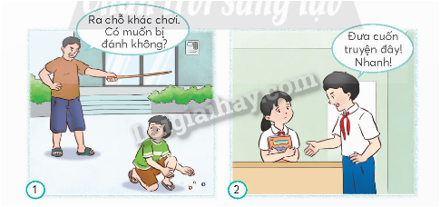 Tranh 2: Cậu con trai đòi cô bé phải giao nộp quyển sách ra: hành vi bạo lực học đường