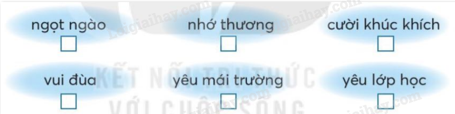 Em đọc kỹ bài đọc trong sách giáo khoa và tích vào ô trống dưới những từ ngữ thể hiện rõ nhất tình cảm của bạn nhỏ dành cho trường lớp.