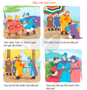 – Tranh 3: Vua nói: “Quốc Toản làm trái phép nước, lẽ ra phải trị tội. Nhưng còn trẻ mà đã biết lo việc nước, ta có lời khen.” và ban cho Quốc Toản một quả cam.