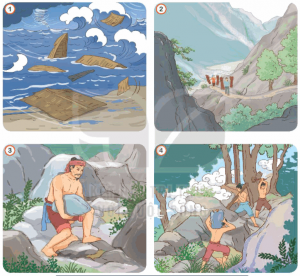 – Bức tranh thứ 3: Cố Đương thấy bà con vất vả, liền nảy ý định ghép đá thành bậc thang đi lên núi.