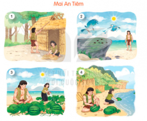 – Tranh 1: Ngày xưa, có một người tên là Mai An Tiêm được Vua Hùng yêu mến nhận làm con nuôi. Một lần, vì hiểu lầm lời nói của An Tiêm nên nhà vua nổi giận, đuổi An Tiêm ra đảo hoang. Ở đảo hoang, hai vợ chồng An Tiêm dựng nhà bằng tre nứa, lấy cỏ phơi khô tết thành quần áo.