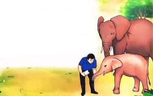Rồi ba cầm một bình sữa to đến chỗ chú voi con. Nhìn thấy ba, nó mừng rỡ chạy tới. Cặp mắt nhỏ sáng lên. Hai cái tai to như hai cái quạt luôn ve vẩy. Nó há miệng chờ ba cho uống sữa. Nó vừa uống, vừa đưa cái vòi dài hôn lên tay ba. Vẻ mặt nó hớn hở, trông thật đáng yêu.