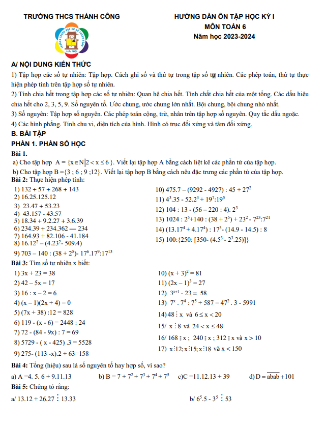 Chào mừng quý thầy cô giáo và các em học sinh lớp 6! Hôm nay, Sytu xin giới thiệu đến mọi người đề cương hướng dẫn ôn tập cuối học kỳ 1 môn Toán lớp 6 năm học 2023 – 2024 tại trường THCS Thành Công, thành phố Hà Nội.