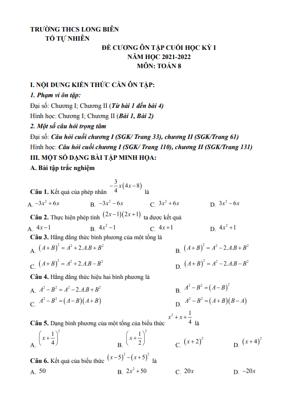 Ôn tập cuối học kì 1 (HK1) lớp 8 môn Toán năm 2021 2022 trường THCS Long Biên Hà Nội