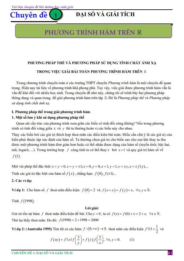 Phần đầu của tài liệu chúng ta sẽ tìm hiểu về phương pháp thế trong giải phương trình hàm. Chúng ta sẽ cùng nhau xem xét một số lưu ý khi sử dụng phương pháp này, qua đó làm rõ qua các ví dụ và bài tập vận dụng để củng cố kiến thức.