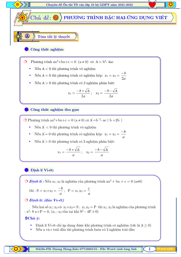 Cùng với sự hướng dẫn cụ thể và dễ hiểu từ thầy giáo Dương Minh Hùng, tài liệu này sẽ giúp học sinh nắm vững kiến thức về phương trình bậc hai, hệ thức Vi-ét và ứng dụng của chúng, từ đó có thể tự tin hơn trong việc làm bài tập và ôn thi. Mục tiêu cuối cùng là giúp học sinh đạt kết quả tốt trong môn Toán và phát triển khả năng tư duy logic.