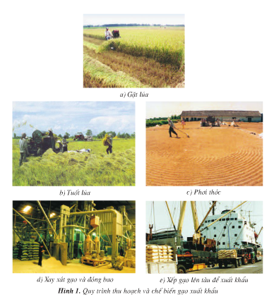 Quan sát các hình dưới đây, kể tên theo thứ tự các công việc trong thu hoạch và chế biến gạo xuất khẩu ở đồng bằng Nam Bộ.