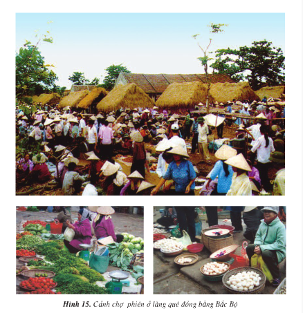 Cảnh chợ phiên ở đồng bằng Bắc Bộ đông đúc, nhộn nhịp, bán đa dạng các mặt hàng, đặc biệt là nông sản.