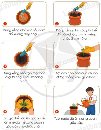 Quan sát hình và mô tả các thao tác trồng cây hoa cúc chuồn trong chậu.