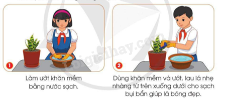 Quan sát hình và thông tin dưới đây, em hãy mô tả công việc lau lá cây lưỡi hổ trồng trong chậu.