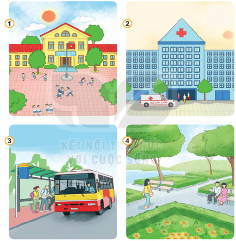 – Kể tên địa điểm công cộng trong những tranh trên.