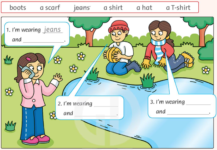 3. I’m wearing a scarf and aT-shirt. (Tôi đang quàng một chiếc khăn và mặc một chiếc áo phông.)