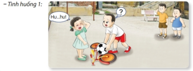 Tin và các bạn chơi đá bóng, vô tình đá vào em gái đang đi xe đạp gần đó, làm đổ xe của em. Giải quyết: Nếu em là Tin, em sẽ xin lỗi em gái, dựng xe em lên và hỏi xem em có làm sao không, dỗ dành em gái và hứa lần sau sẽ cẩn thận hơn.