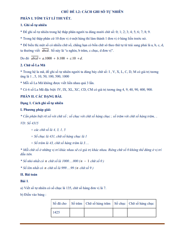 Tài liệu dạy thêm học thêm chuyên đề cách ghi số tự nhiên là một tài liệu giúp học sinh lớp 6 nắm vững cách ghi số và các phương pháp giải các dạng toán liên quan đến số tự nhiên. Tài liệu gồm 7 trang, được chia thành hai phần chính: phần tóm tắt lý thuyết và phần giải bài tập chuyên đề.Phần I – Tóm tắt lý thuyết, tập trung trình bày và điểm qua những kiến thức cơ bản về cách ghi số tự nhiên. Một số điểm cần chú ý trong phần này bao gồm:- Cần phân biệt rõ số với chữ số, số chục với chữ số hàng chục và số trăm với chữ số hàng trăm.- Mỗi chữ số ở các vị trí khác nhau sẽ có giá trị khác nhau. Chữ số 0 không thể đứng ở vị trí đầu tiên.- Số nhỏ nhất có n chữ số là 1000…000 (n-1 chữ số 0) và số lớn nhất có n chữ số là 999…99 (n chữ số 9).Phần II – Các dạng bài, bao gồm các phương pháp giải và bài tập chuyên đề liên quan đến cách ghi số tự nhiên. Các dạng bài chủ yếu gồm:- Dạng 1: Cách ghi số tự nhiên. Giải các bài tập như phân biệt chữ số, chữ số hàng chục và hàng trăm của một số.- Dạng 2: Viết số tự nhiên có m chữ số từ n chữ số cho trước. Bao gồm các bước chọn số hàng cao nhất, xếp các số còn lại vào các hàng tiếp theo. Chú ý không để chữ số 0 đứng đầu.- Dạng 3: Tính số các số tự nhiên. Gồm cách tính số các chữ số có n chữ số và đếm số các số tự nhiên từ a đến b với khoảng cách d giữa hai số.Ngoài ra, còn có dạng bài 4 về đọc và viết các số bằng chữ số La Mã. Sử dụng bảng số La Mã để biểu diễn các số từ 1 đến 1000.Tài liệu này được thiết kế nhằm hỗ trợ giáo viên và học sinh lớp 6 trong quá trình dạy và học thêm môn Toán. Các minh họa được trình bày cụ thể, dễ hiểu và sắc thái truyền đạt của tài liệu giúp học sinh tăng cường hiểu biết và kỹ năng về cách ghi số tự nhiên. Bản tải về cung cấp dưới định dạng Word để thuận tiện cho quý thầy cô.