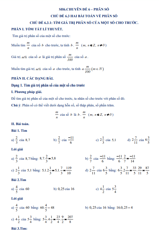 Tài liệu dạy thêm học thêm chuyên đề hai bài toán về phân số là một tài liệu tổng hợp và tóm tắt lý thuyết, hướng dẫn phương pháp giải các dạng toán và bài tập chuyên đề hai bài toán về phân số. Tài liệu này được thiết kế nhằm hỗ trợ giáo viên và học sinh lớp 6 trong quá trình dạy thêm và học thêm môn Toán.Tài liệu này gồm 23 trang và được chia thành hai chủ đề chính. Chủ đề 6.3.1: Tìm giá trị phân số của một số cho trước.- Phần I: Tóm tắt lý thuyết giúp học sinh nắm vững các kiến thức cần thiết về tìm giá trị phân số của một số cho trước.- Phần II: Cung cấp các dạng bài và hướng dẫn cách giải. Dạng bài đầu tiên là tìm giá trị phân số của một số cho trước bằng cách nhân số cho trước với phân số đó. Dạng bài thứ hai là bài toán dẫn đến việc tìm giá trị phân số của một số cho trước. Hướng dẫn giải từng dạng bài dựa trên nội dung cụ thể từng bài toán.Chủ đề 6.3.2: Tìm một số biết giá trị phân số của nó.- Phần I: Tóm tắt lý thuyết giúp học sinh hiểu các phương pháp tìm một số biết giá trị phân số của nó.- Phần II: Cung cấp các dạng bài và hướng dẫn cách giải. Dạng bài đầu tiên là tìm một số biết giá trị một phân số của nó bằng cách chia giá trị đó cho phân số. Số được tìm có thể được viết dưới dạng hỗn số, số thập phân hoặc số phần trăm. Dạng bài thứ hai là bài toán dẫn đến việc tìm một số biết giá trị một phân số của nó. Hướng dẫn giải từng dạng bài dựa trên nội dung cụ thể từng bài toán. Dạng bài thứ ba sử dụng máy tính để tìm một số biết giá trị một tỉ số phần trăm của nó, và dạng bài thứ tư là tìm số chưa biết trong một tổng hoặc một hiệu bằng cách sử dụng quan hệ số chưa biết và các số đã biết trong phép cộng và phép trừ.Tài liệu này sẽ được cung cấp dưới định dạng file WORD để giáo viên dễ dàng sử dụng và chỉnh sửa.Với tài liệu này, giáo viên và học sinh lớp 6 sẽ có nguồn tư liệu hữu ích để nắm vững và rèn luyện các kỹ năng giải các bài toán liên quan đến hai chủ đề về phân số. Tài liệu hướng dẫn chi tiết và cụ thể, giúp học sinh hiểu rõ và áp dụng hiệu quả trong quá trình học tập.