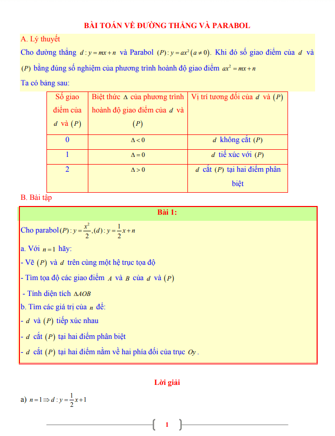 Tài liệu học Toán lớp 9 chủ đề đường thẳng và parabol