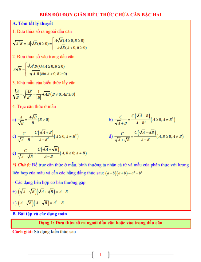 - Dạng 1: Đưa thừa số ra ngoài hoặc vào trong dấu căn.