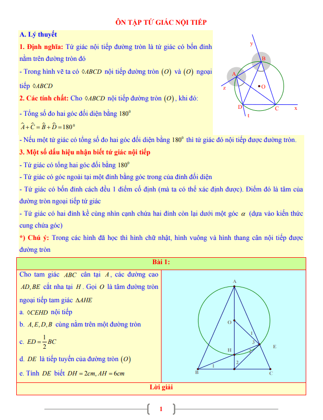1. Định nghĩa: Tứ giác nội tiếp đường tròn là tứ giác có bốn đỉnh nằm trên đường tròn.