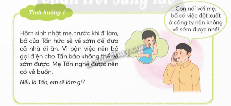 – Tình huống 1. Nay là sinh nhật mẹ, bố hứa về sớm nhưng vì bận việc nên không về sớm được. Mẹ Tấn đã rất buồn. Nếu em là Tấn, khi nói chuyện điện thoại với bố, em sẽ nói với bố rằng cố gắng hoàn thành công việc để về sớm nhất. Còn về phía mẹ, Tấn có thể an ủi mẹ và nói rằng bố chỉ về muộn chút thôi.