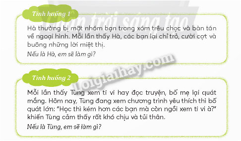 Tình huống 1: Nếu em là Hà, em sẽ nói chuyện trực tiếp với các bạn, bảo rằng ai cũng muốn mình xinh đẹp nhưng không phải ai cũng có quyền lựa chọn. Hà mong các bạn tôn trọng mình và không nói như vậy nữa.