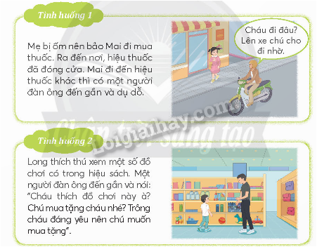 Tình huống 1: Mai đi mua thuốc cho mẹ nhưng lại bị một người đàn ông dụ dỗ. Nếu em là Mai trong tình huống này, em sẽ từ chối người đàn ông và tự tìm hiệu thuốc khác.