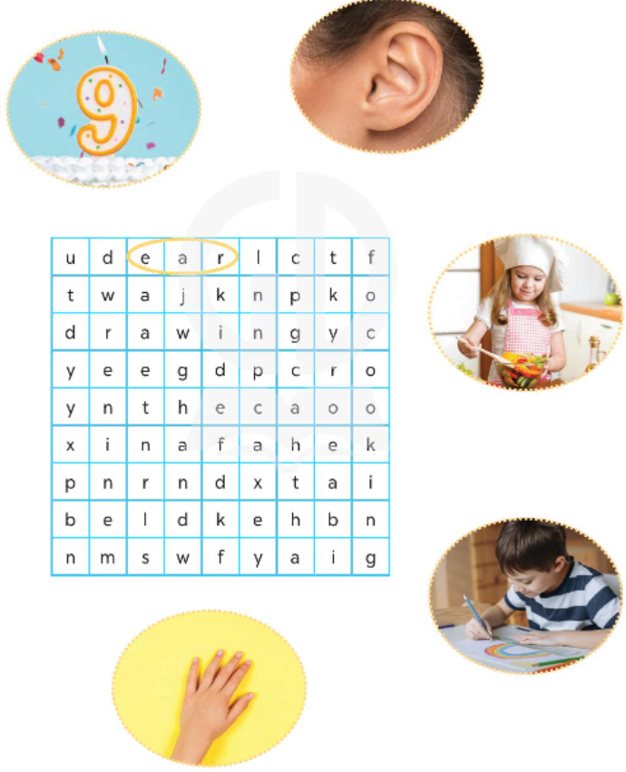 Tiếng Anh lớp 3 Fun Time trang 42 Global Success: Find, circle and match. (Tìm, khoanh tròn, và nối). ear: tai cook: nấu ăn hand: bàn tay nine