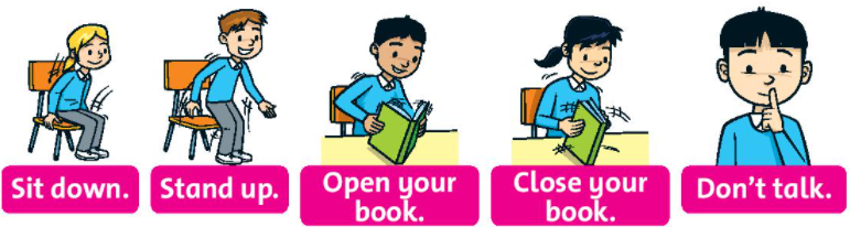 Tiếng Anh lớp 3 Starter Lesson Six trang 9 Family and Friends: Sit down. (Ngồi xuống). Stand up. (Đứng lên). Open your books. (Mở sách ra). Close your books