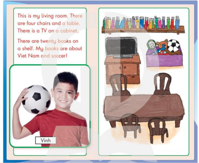 (Có 4 cái ghế, 1 cái bàn, 1 ti vi, 1 cái tủ, 1 cái kệ, 20 quyển sách và một số món đồ chơi ở trong phòng khách.)