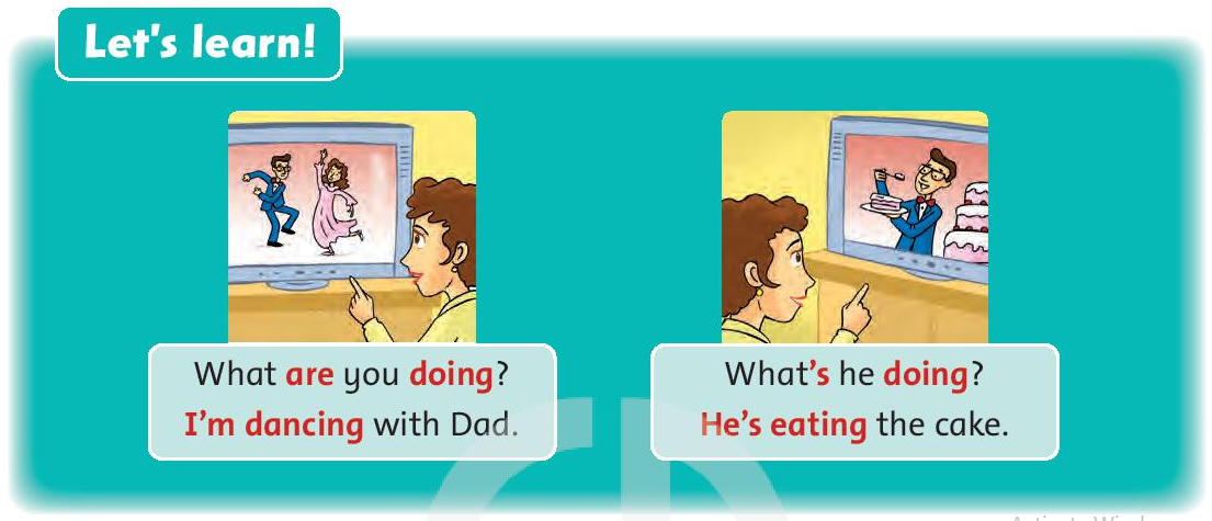 – What’s he doing? (Anh ấy đang làm gì vậy?)