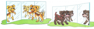 3. Một chú chó khác mặt mũi cau có, ủ rũ cũng đi vào ngôi nhà bán gương. Khi nhìn thấy có bao nhiêu con chó mặt mày cau có, xấu xí đang nhìn mình, chó ta sủa ầm lên, những con chó kia cũng sủa ầm lên. Con chó sợ quá, hốt hoảng chạy ra ngoài. Nó nghĩ: “Nơi này thật khủng khiếp. Ta sẽ không bao giờ đến đây nữa!”.
