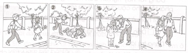 Tranh 2 : Bỗng cô bé vấp phải hòn đá, và bị ngã xuống đường.