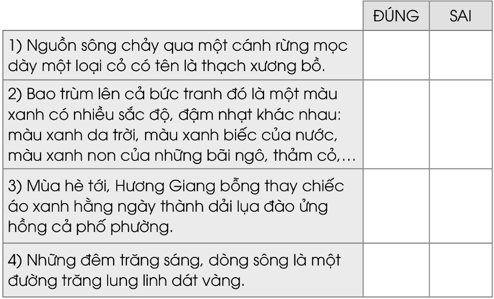 Tìm những hình ảnh minh họa cho nhận xét nói trên về vẻ đẹp của sông Hương. Đánh dấu √ vào ô thích hợp: